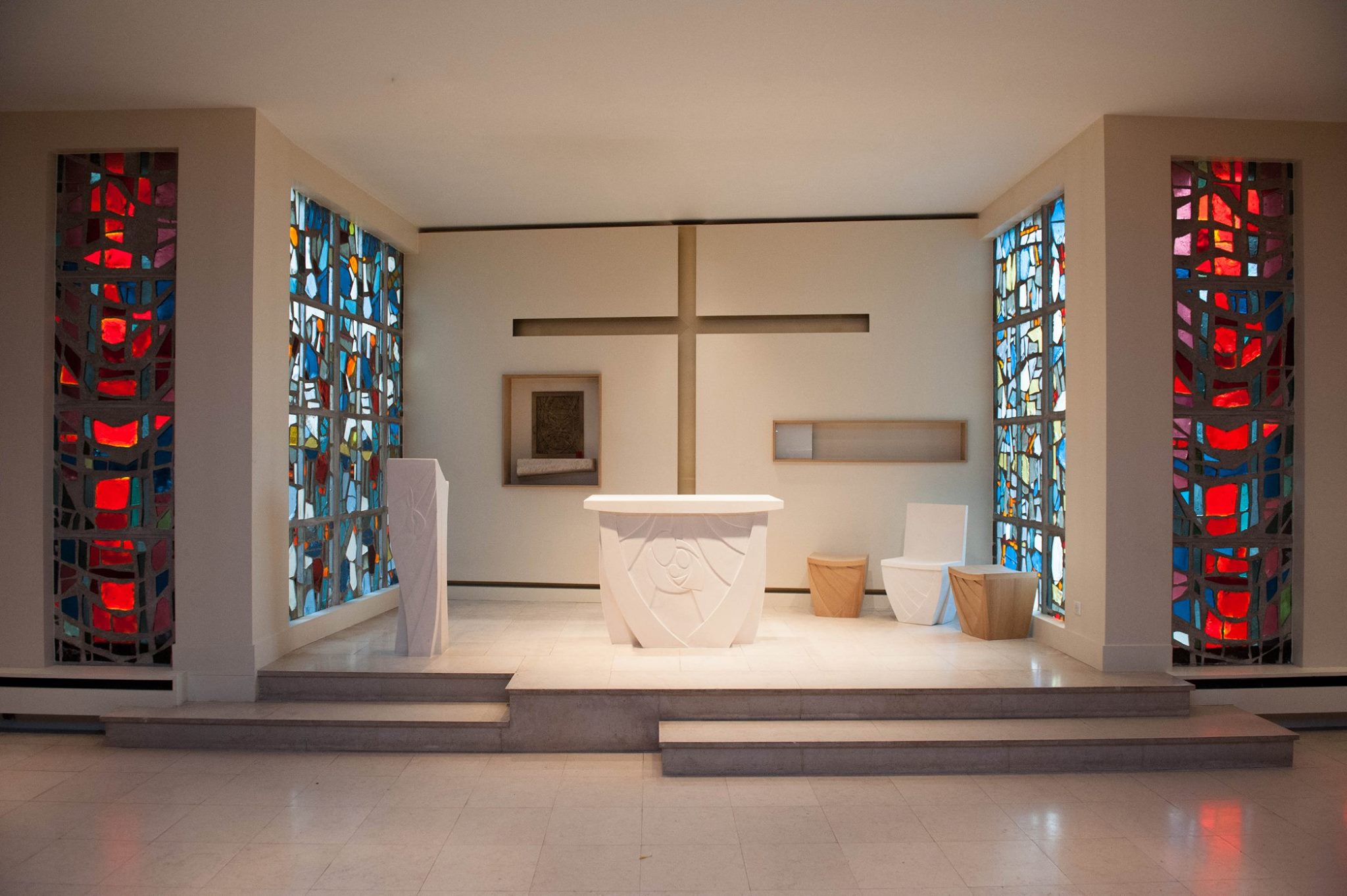 Les lumières qui inondent le chœur de la chapelle par les vitraux et par le rayonnement de la croix, ont inspiré ces dessins. Les rayons qui jaillissent de la croix viennent marquer de leur présence chaque objet : l’autel, l’ambon et le fauteuil de présidence. Cet ensemble a été modélisé par Camille Bisson, sculpté par Jean-Joseph Chevalier et Jean-Baptiste LeclerC